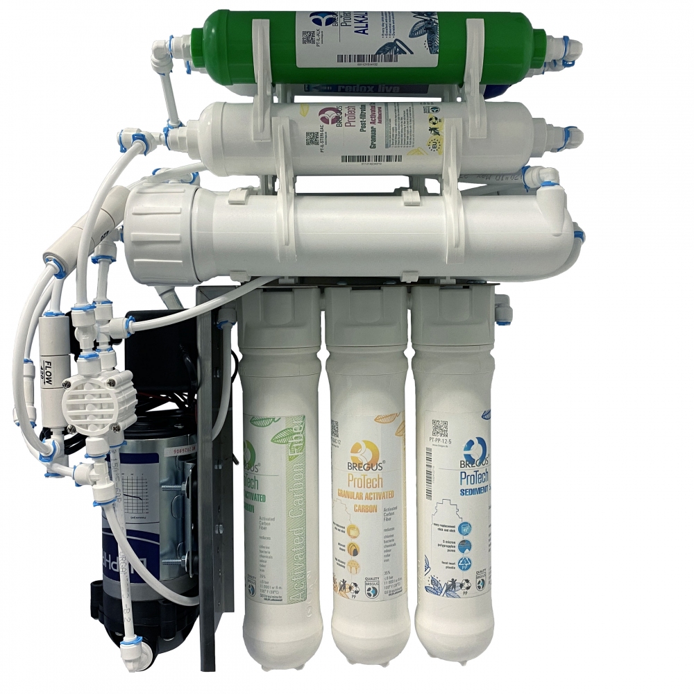 Bregus® ProTech 150RP створений для клієнтів, які хочуть отримати не просто фільтр для води під мийку, а продуману преміальну систему зворотного осмосу з насосом. Система очищує воду від механічних домішок, хлору, солей жорсткості, нітратів, неприємного запаху та інших небажаних речовин, а після мембрани виконує додаткове кондиціонування води для приємного щоденного споживання.