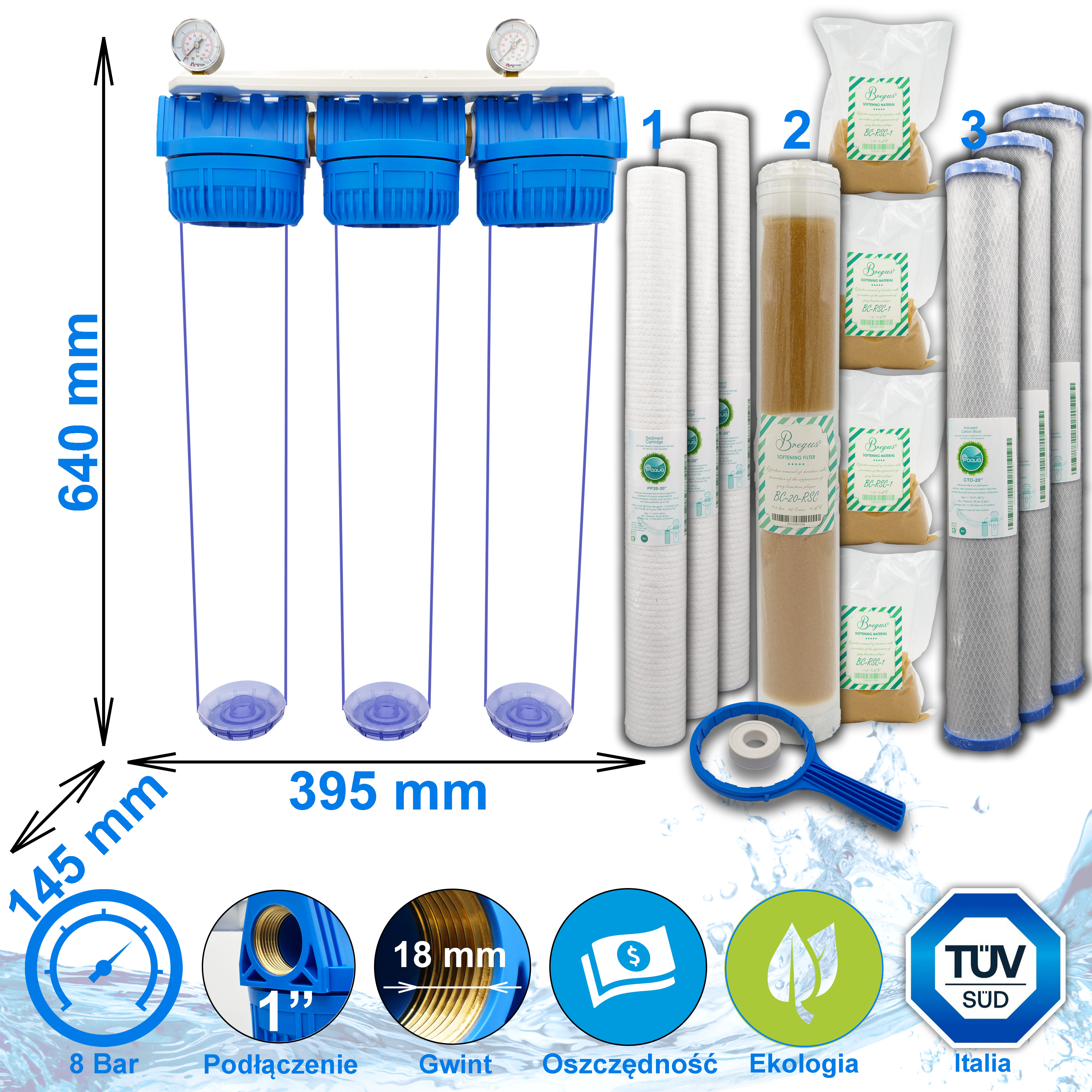 У разі зміни якості води з джерела (збільшення вмісту заліза або зменшення механічних забруднень) можна застосувати комбінацію 10" + 20" + 20" для зменшення витрат на механічну фільтрацію, а до двох корпусів 20" встановити картриджі для видалення заліза.