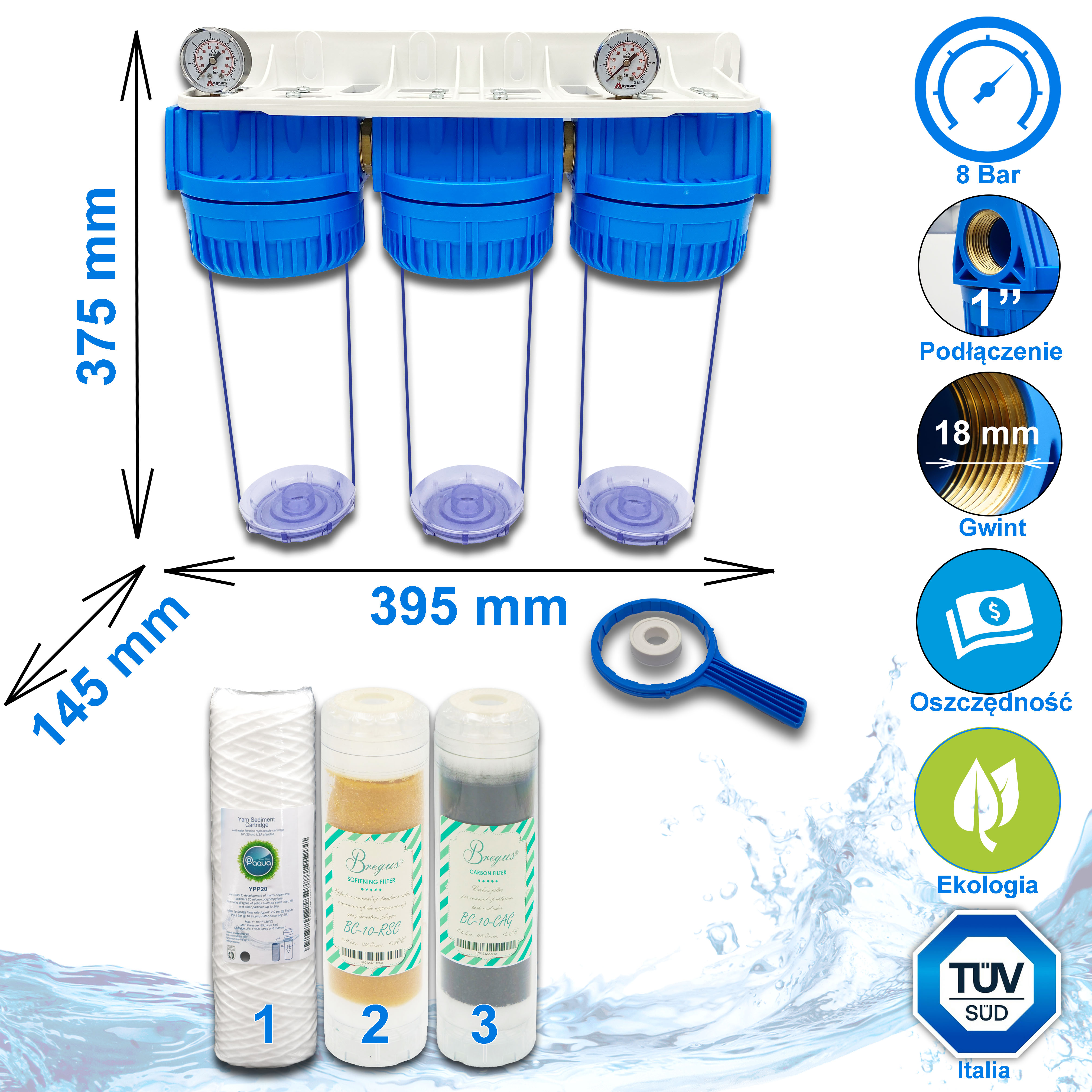 Триступенева система пом'якшення Paqua 10" з картриджами, підключенням 1", призначений для механічної та вугільної очистки води на весь дім.