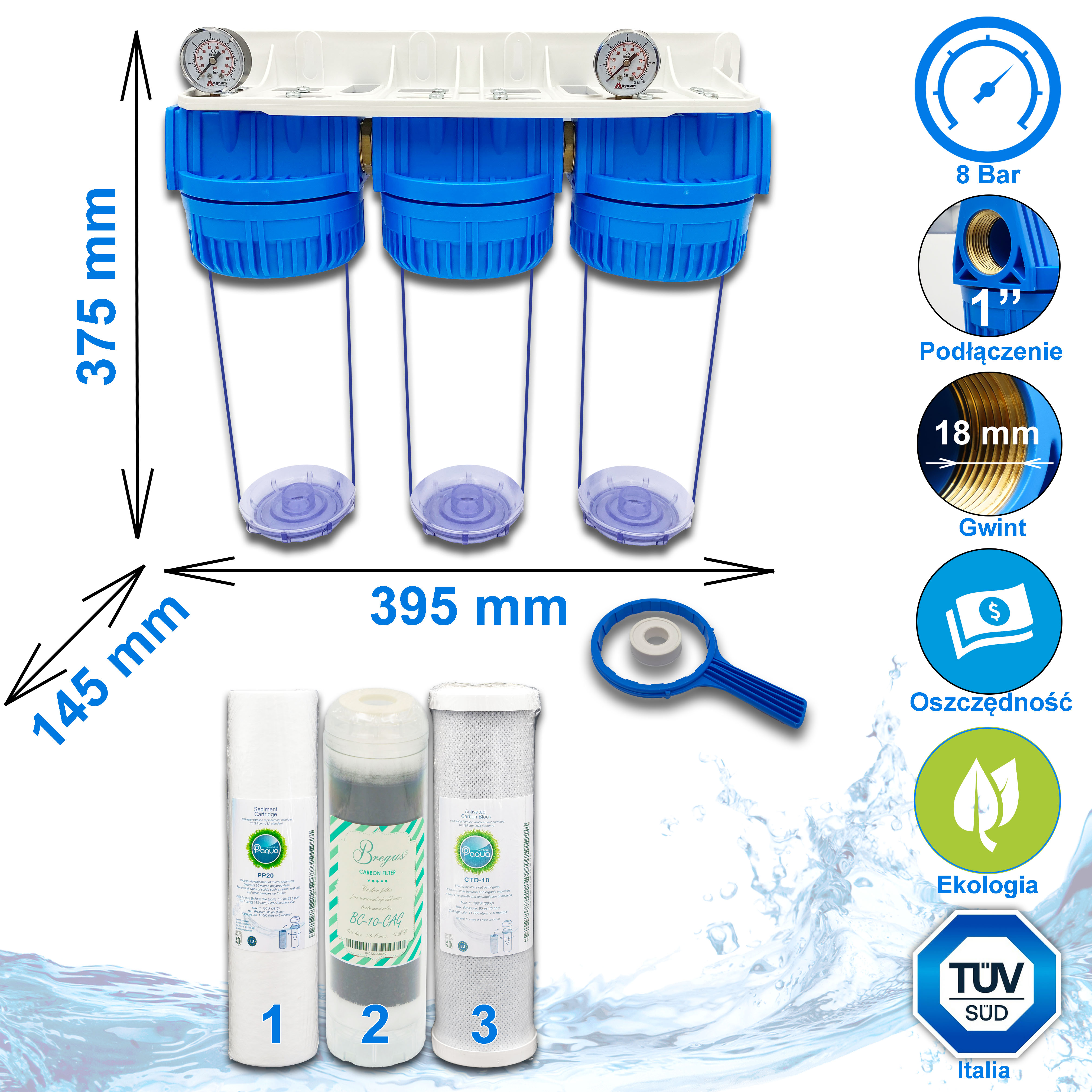 - 3 трикомпонентні корпуси 10" Standart на монтажній плиті (стелажі), легко розбираються та стійкі до перепадів тиску
